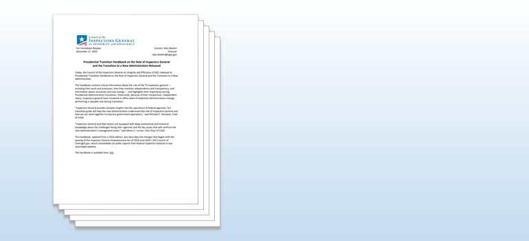 Presidential Transition Handbook on the Role of Inspectors General and the Transition to a New Administration Released. Read the report here Image: Hero Cover Link: https://www.ignet.gov/sites/default/files/PresidentialTransitionHandbook.pdf